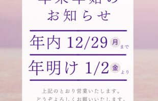 年内の営業は12月29日(月)までとなります。年明けは1月は2日(金)より営業…